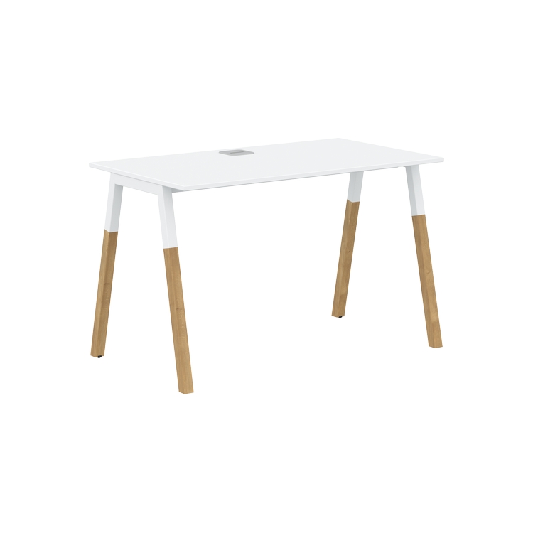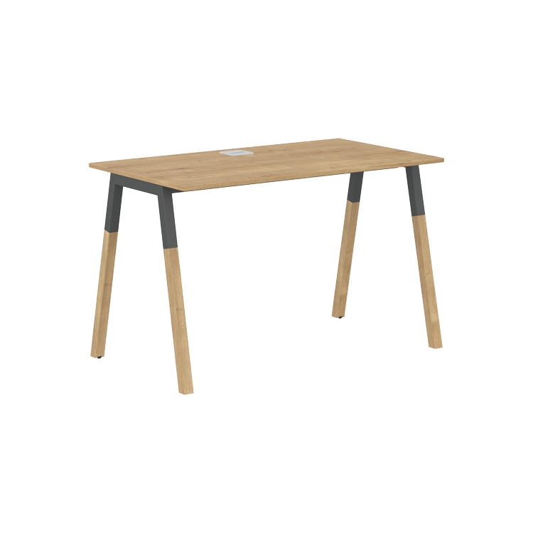 Столешница прямолинейная из ЛДСП т.18 мм. c кромкой ABS т.2 мм, комплектуется квадратной заглушкой кабель-канала по центру, 2-мя траверсами и комбинированными опорами А-образной формы, верхняя часть из профиля трубы 40х40 мм и нижняя часть из массива бука; отделка – масло-воск.