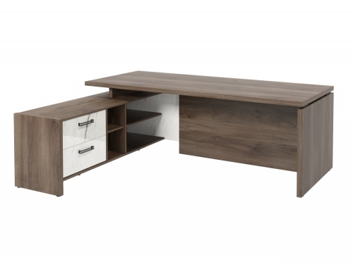 Столешница, бок стола и бок тумбы выполнены из ЛДСП толщиной 38 мм. Цвет - "Орех Пацифик Табак". Кромка 2 мм.